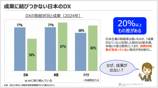上記のデータから、日本企業は「DXの取り組み状況においては、健闘しているものの、成果が出ていない」ということが明らかです。